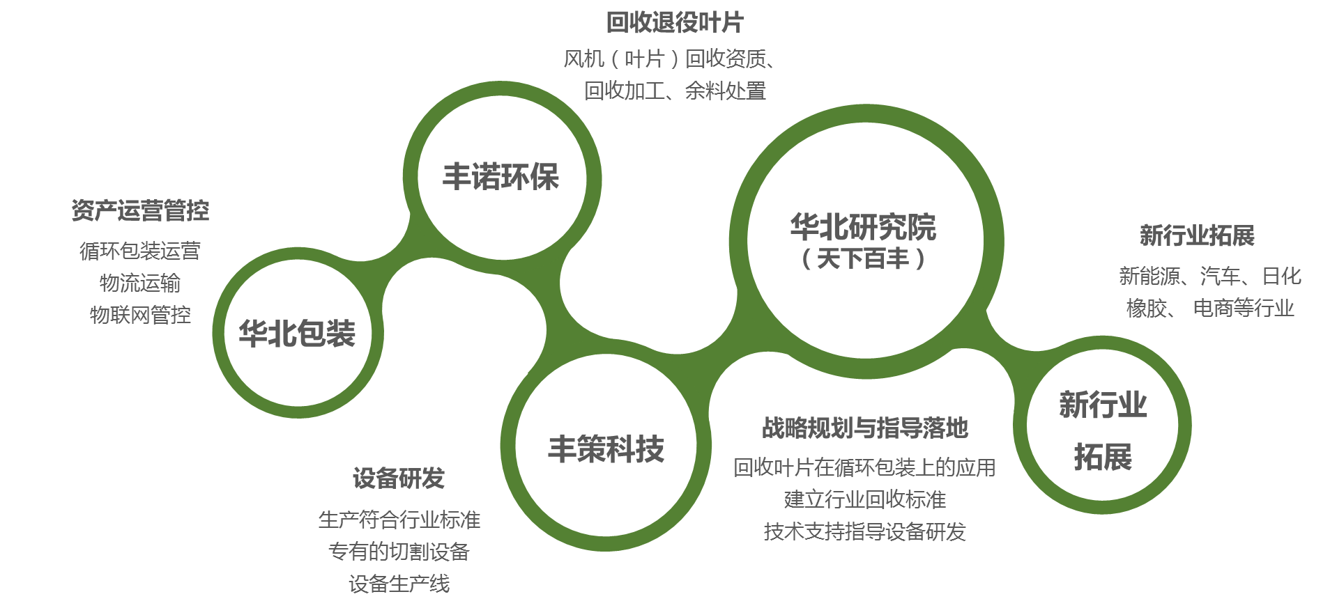 未来的瑞和将在瑞和研究院的指导下以集团化产业链的结构发展。以丰诺环保回收叶片,用丰策科技的专有设备生产耐用高效的best365英国体育在线,由瑞和控股资产运营团队借增效降本能力,实现公司整体的健康、快速发展,让环保、科技、循环于各产业各行业协同发展。